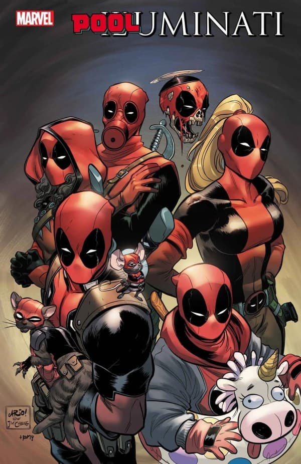 Pooluminati #1 (2025) : THE ELITE ‘POOLS ASSEMBLE! There are those who hold power, and those who hold the secret power in the world. Those who shape the world around us, who pull the strings, unseen. They are… the POOLUMINATI. Or, wait, no, that’s the Illuminati, so what the heck does the Pooluminati do? It’s TOO SECRET… but WADE WILSON is ABOUT TO FIND OUT! The most elite DEADPOOLs across the Multiverse assemble, and they need the 616’s Deadpools. But will Wade (with Ellie’s help) prove himself worthy of the Pooluminati? And even if he does…will the conspiracy theory they uncover spell disaster for ‘Pools everywhere?